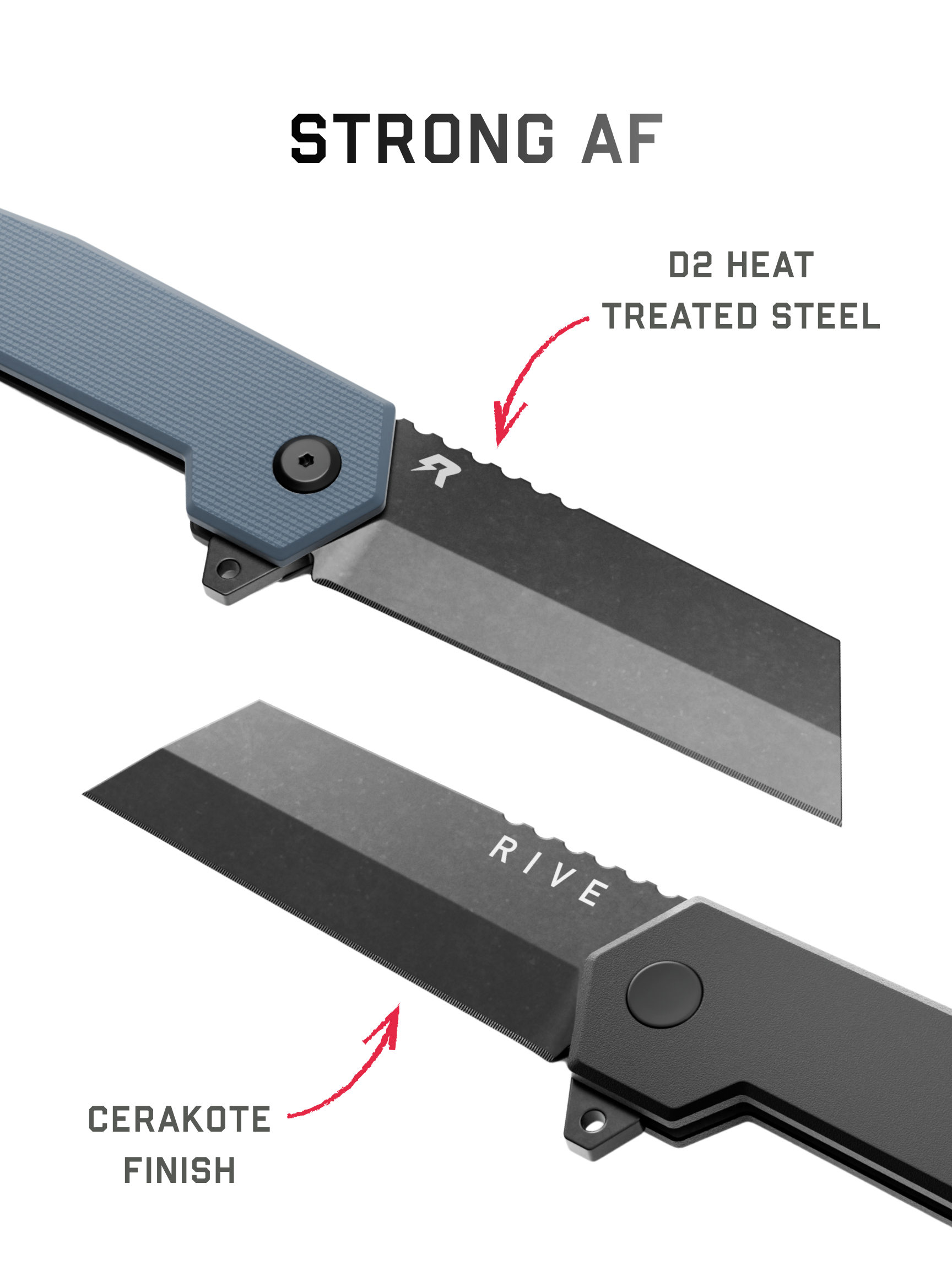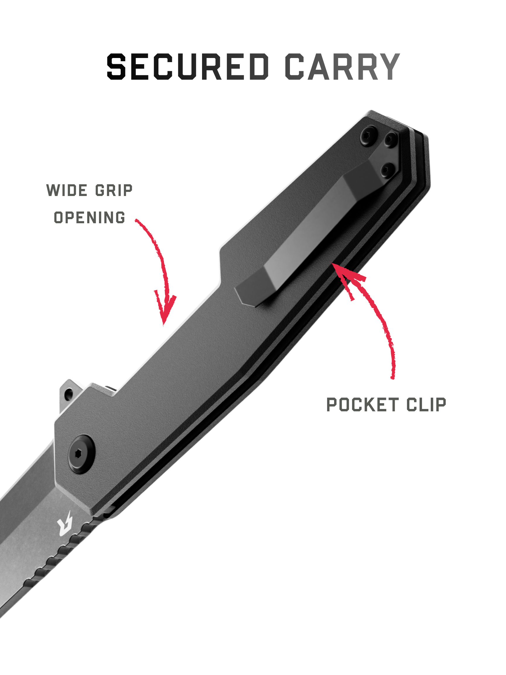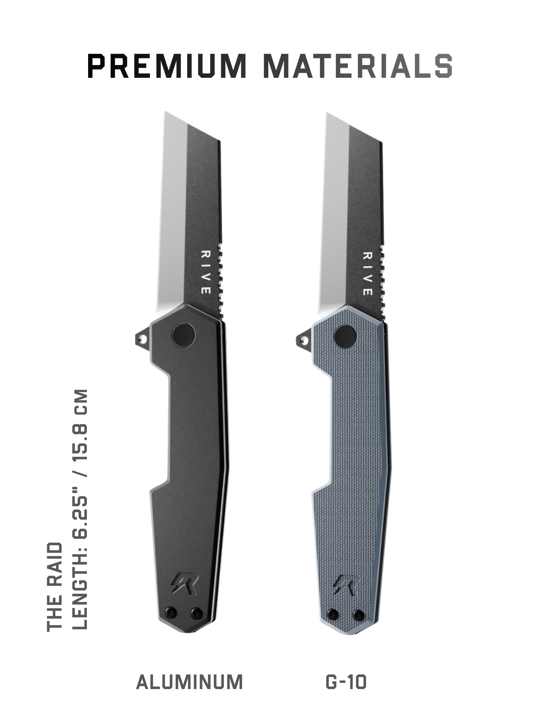 Crafted from indestructible G-10 composite. The Raid is the ultimate pocket companion. Double-caged ball bearings offer a perfectly balanced pivot system for smooth one-handed operation of the premium D2 Cerakote heat-treated reverse tanto blade. Featuring a pocket clip & jimping for extra grip.
